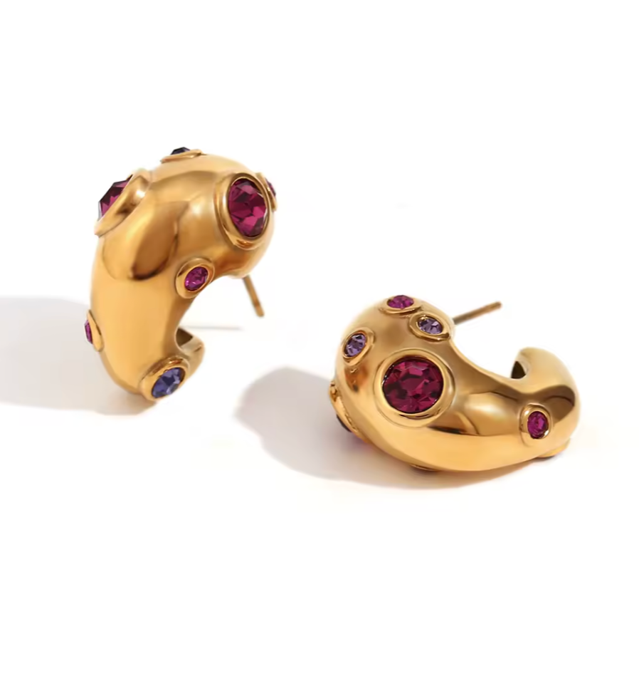 After hours start with the After Midnight Mini — the ultimate go-to for those late nights when glam is non-negotiable. These bold yet subtle, sculptural mini hoops feature striking gemstone accents in deep, seductive hues, adding a touch of mystery and elegance to your look as you dance and flirt.